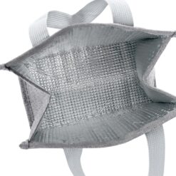 Bolsa térmica oxford com capacidade de 8 litros com fechamento em velcro. Contém alças de mãos e plaquinha personalizável fixa.