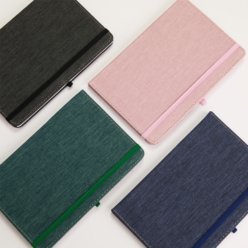 Caderneta com capa dura em linho, fechamento em elástico, marca-páginas em fita de cetim e porta-caneta elástico. Possui cerca de 80 folhas brancas pautadas.