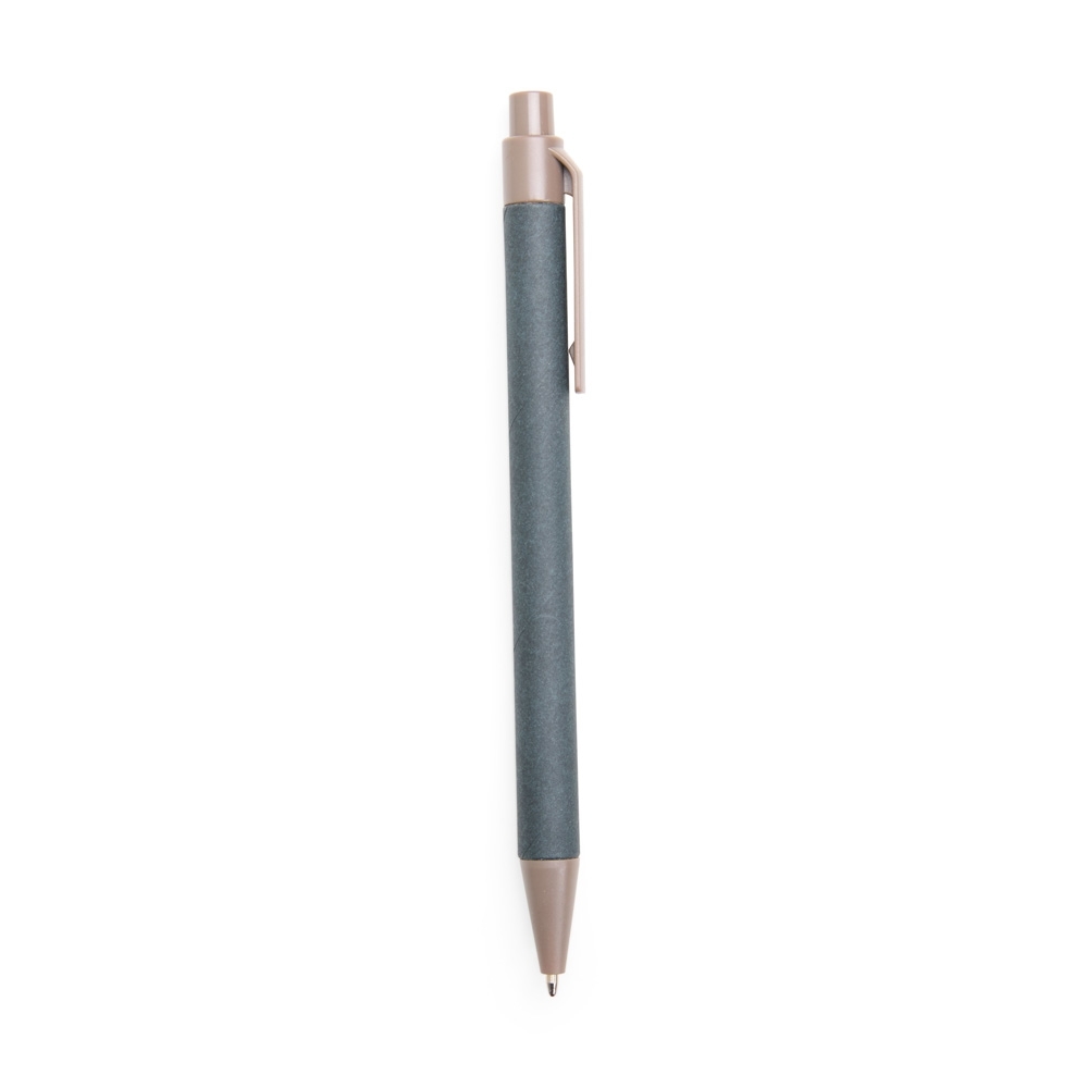 Caneta com corpo em papelão, ponteira e clip em plástico ABS, com acionamento por clique e carga esferográfica azul de 1,0mm.