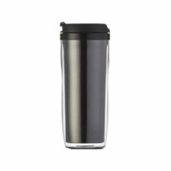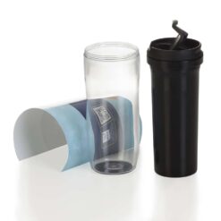 Copo plástico 350ml porta foto. Possui tampa plástica com ?alavanca? para abrir/fechar compartimento para beber. Copo preto em pvc, basta rosqueá-lo para tirar da base acrílica. Copo acrílico com o fundo externo emborrachado. Para colocar a foto basta envolver o papel sob o copo preto e encaixá-lo sob a base acrílica.