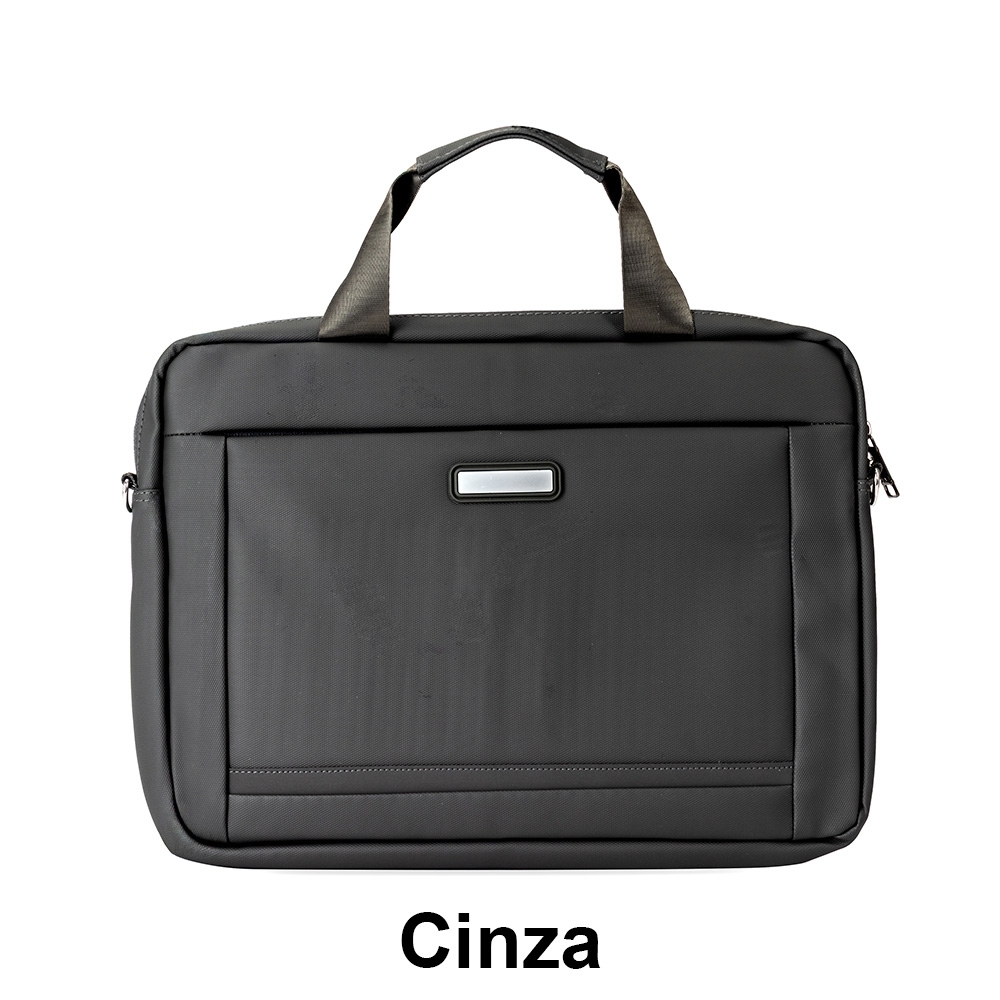 Pasta para notebook confeccionada em couro sintético impermeável com fechamento em zíper e capacidade para aparelhos de até 15,6 polegadas. Possui dois compartimentos: o principal, com revestimento acolchoado, quatro bolsos abertos de tamanhos diferentes e duas divisórias para canetas; e o frontal, com plaquinha metálica fixa na parte externa. Conta ainda com duas alças de mão e um par de abas metálicas para alças removíveis. Acompanha alça de ombro ajustável.