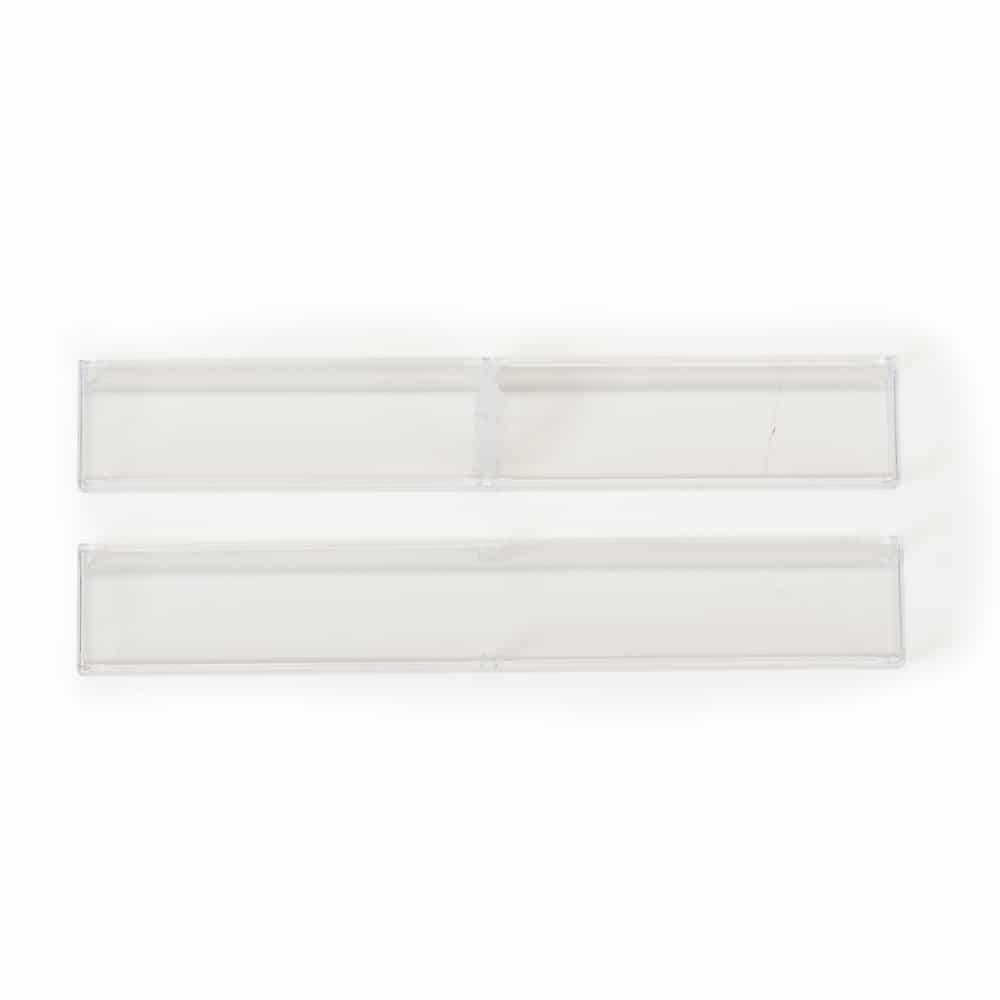 Tubo de acrílico retangular, há uma espécie de ?anel? central emborrachado para sustentar/encaixar a caneta. OBS.: PEDIDO APENAS MÚLTIPLO DE 50 PEÇAS!